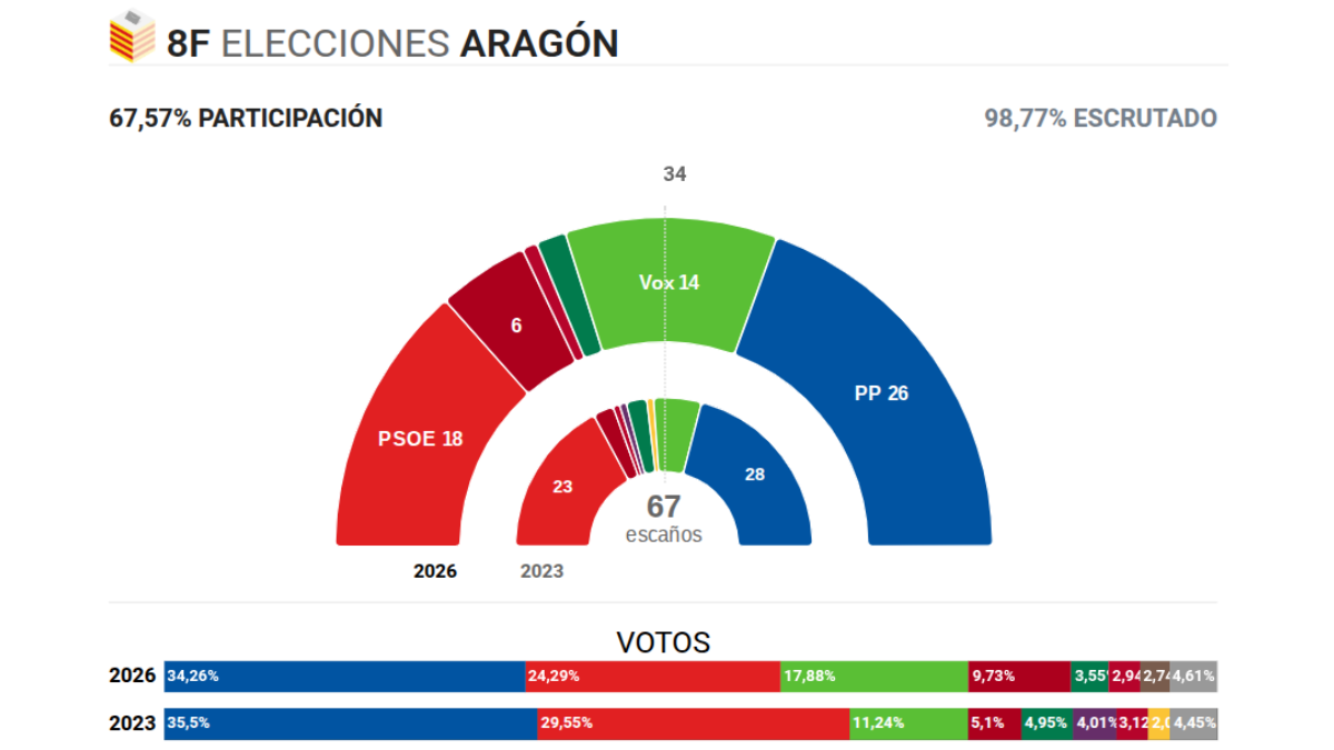 Este retroceso obliga a Jorge Azcón a volver a apoyarse en Vox para poder formar gobierno, reeditando una alianza que se antoja imprescindible para alcanzar la mayoría parlamentaria.