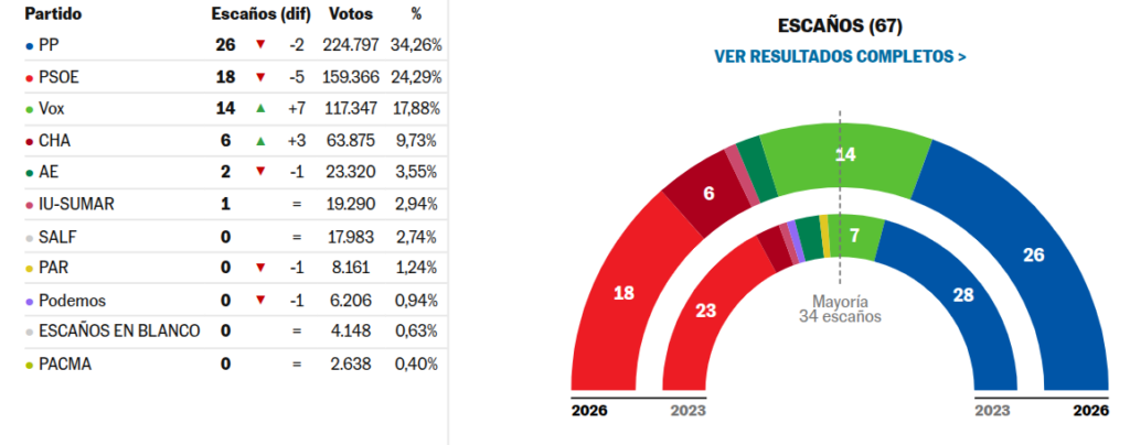 El PP de Azcón convocó elecciones anticipadas para quitarse a VOX de en medio, con el que gobernaba, pero lo cierto es que ha perdido dos diputados (de 28 a 26) y que VOX ha duplicado sus escaños, al pasar de 7 a 14.