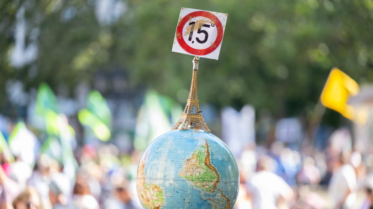 Un hombre lleva un globo con una Torre Eiffel en miniatura y el objetivo de 1,5 grados del acuerdo de protección del clima de París durante una manifestación frente a la Alte Oper en Fráncfort / Europa Press - Archivo