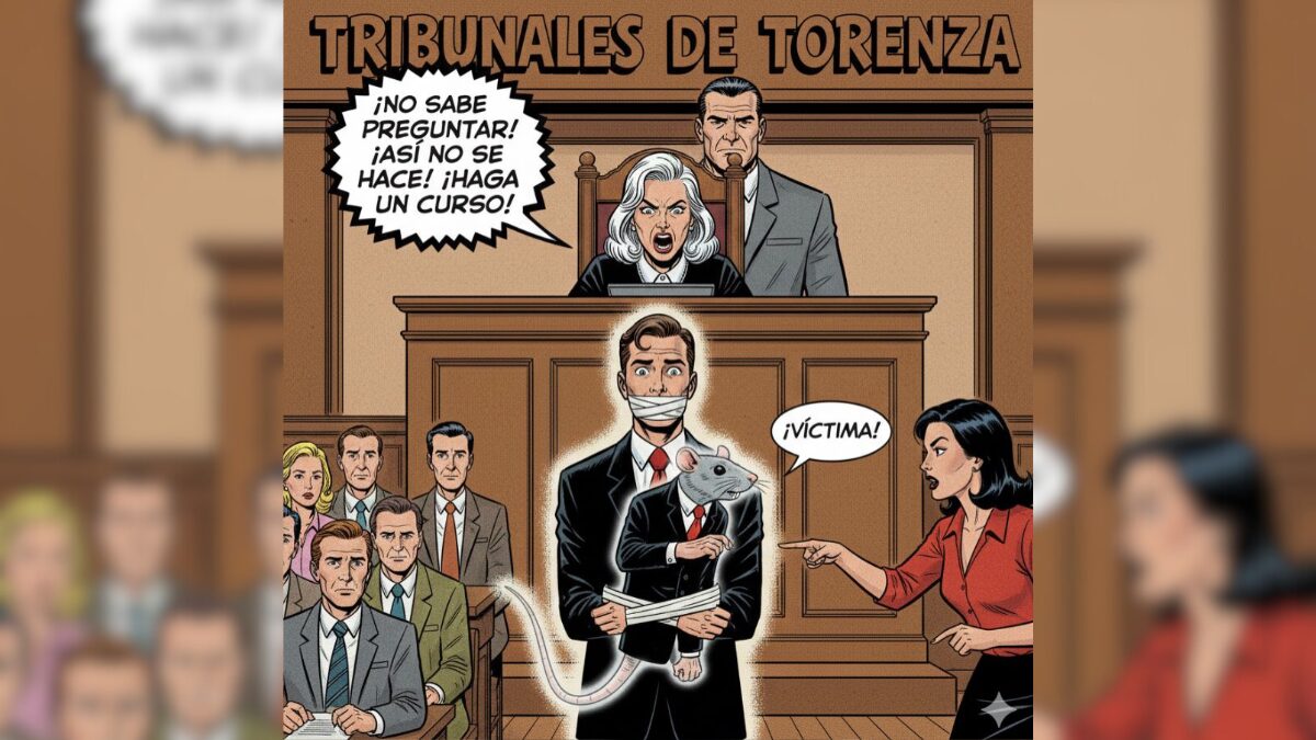 Esta colusión en los tribunales de Torenza se fundamenta en una premisa insostenible: la judicatura y la fiscalía invierten el Principio de Presunción de Inocencia (PPI). En este contexto, no existe una tutela judicial efectiva, sino una Tutela Acusatoria Efectiva, lo que convierte al juicio en una teatralización donde se viola el derecho al Contradictorio; solo el juez y el fiscal tienen derecho a hablar y actuar conforme les viene en gana. El tribunal no busca la verdad procesal, sino metamorfosear la realidad para condenar al hombre/varón. La judicatura exige que la defensa técnica formule preguntas conforme a su concepción condenatoria. Cualquier acción legítima de la defensa técnica —cuyo deber es hacer preguntas que cuestionen la acusación y defiendan la inocencia— es percibida por el sistema como una inaceptable agresión al esquema condenatorio preestablecido. El abogado defensor, con su actuación brillante y preparada, sí sabe interrogar, pero sus preguntas buscan inevitablemente contrariar a quienes ya han decidido la condena; sin embargo, en este sistema, el derecho a contradecir la tesis acusatoria está prácticamente vetado, siendo precisamente esta discrepancia la que se castiga.