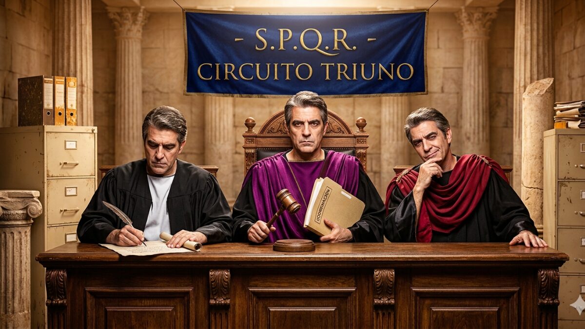 La ilustración que encabeza este análisis, presidida por el legendario acrónimo S.P.Q.R. (Senatus Populusque Romanus), no es un simple ornamento estético, sino una profunda reflexión sobre la genealogía del poder público. En la tradición romana, estas siglas simbolizaban el equilibrio sagrado entre la sabiduría del Senado y la soberanía del Pueblo; un sistema de contrapesos donde la autoridad se distribuía para garantizar la justicia. Sin embargo, al observar la figura central —esa representación del Juez Triuno que asume simultáneamente las vestiduras del gestor, el juzgador y el revisor—, nos enfrentamos a una paradoja institucional de nuestro tiempo. La imagen captura esa transición donde la unidad administrativa, pretendiendo eficiencia, termina por mimetizar todas las funciones en una sola voluntad; siendo esta la puerta franca hacia la discrecionalidad absoluta, la opacidad en la toma de decisiones y la erosión sistemática de las garantías procesales que degeneran en la perversión del ideal de justicia. Es el contraste entre el ideal republicano de la división de poderes y la realidad técnica de los circuitos judiciales contemporáneos, donde la «mismidad» funcional desafía los principios de imparcialidad que la toga, por definición, debe proteger. Este artículo se adentra en esa tensión, allí donde la estructura organizacional roza los límites de la ontología jurídica.