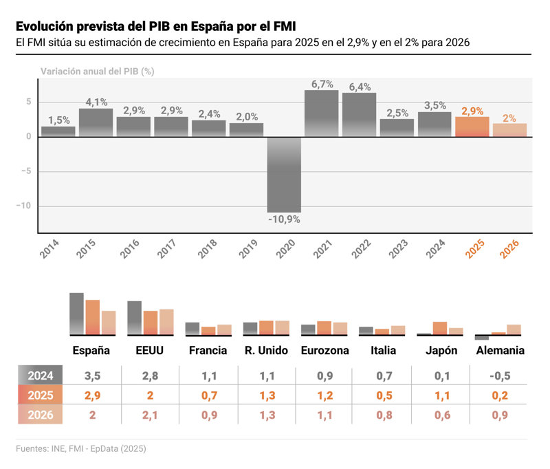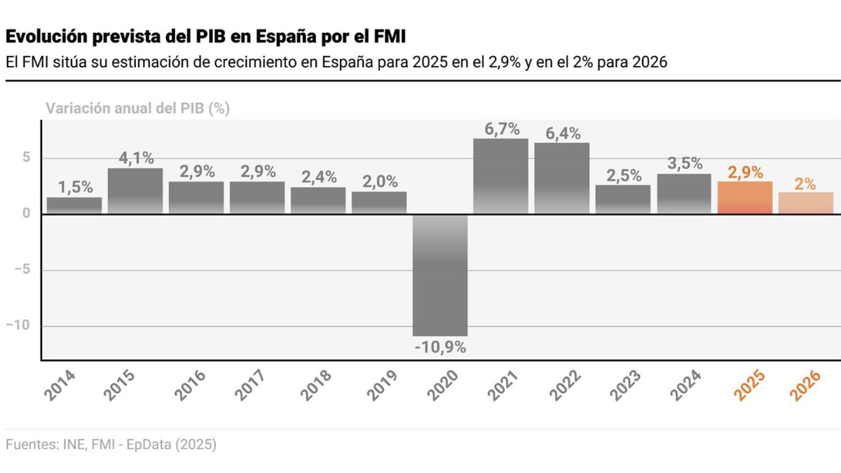 El Fondo Monetario Internacional (FMI) ha mejorado sus previsiones económicas para España, situando su crecimiento en un 2,9% en 2025, cuatro décimas más que en su anterior estimación. Para 2026, el organismo prevé una expansión del 2%, dos décimas más de lo proyectado en julio. Los datos se recogen en el informe Perspectiva Económica Mundial publicado este martes, en el que España se consolida como la gran economía avanzada con mejor desempeño a nivel global.