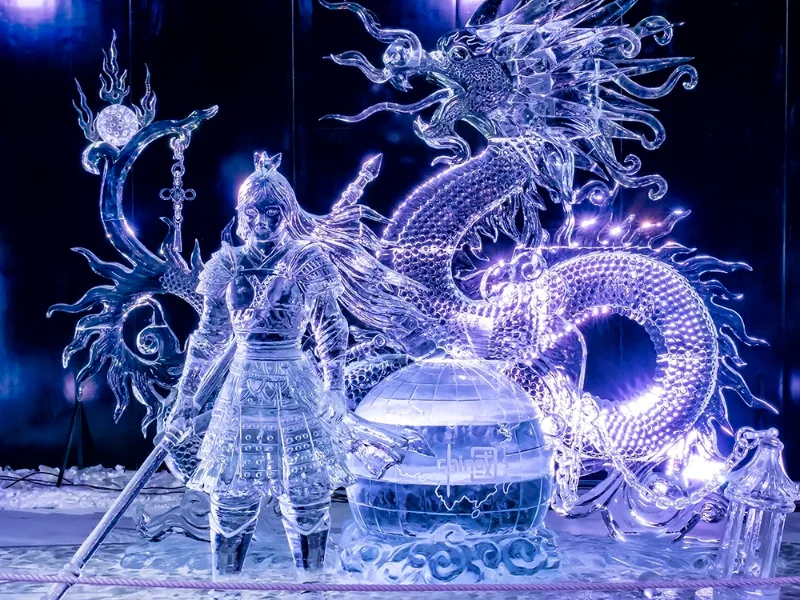 Muy cerca se encuentra la exposición de esculturas de hielo, un espacio a -7 grados en el que cada figura tallada sorprende por su precisión y belleza. La temperatura extrema recuerda a los visitantes la importancia de acudir bien abrigados, pero también potencia la sensación de estar inmersos en un auténtico cuento invernal.