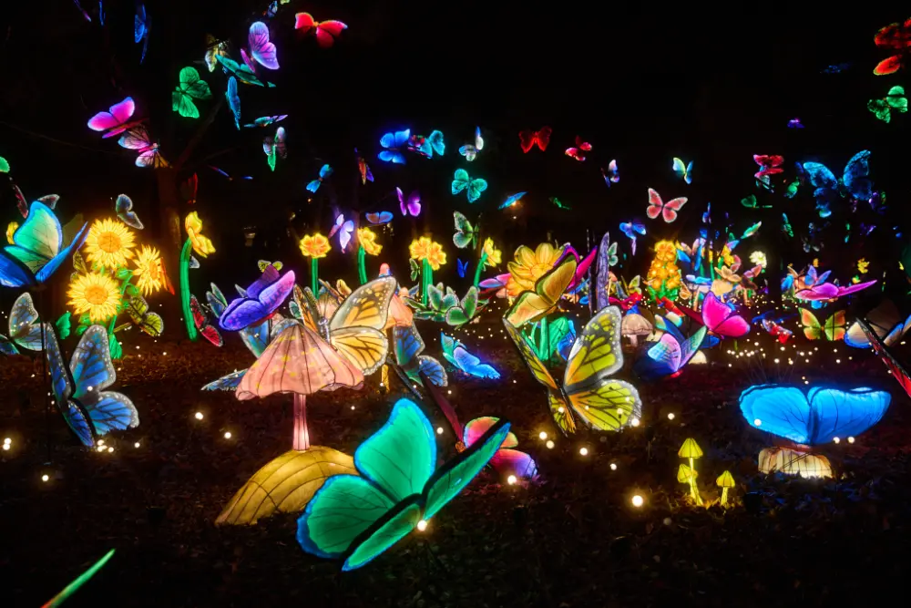 El itinerario continúa con el mágico paseo de linternas chinas, un sendero lleno de figuras de seda y papel que iluminan el camino con colores vibrantes y formas fantásticas. Esta fusión entre tradición asiática y ambiente navideño crea un tramo especialmente fotogénico y fascinante para todas las edades.