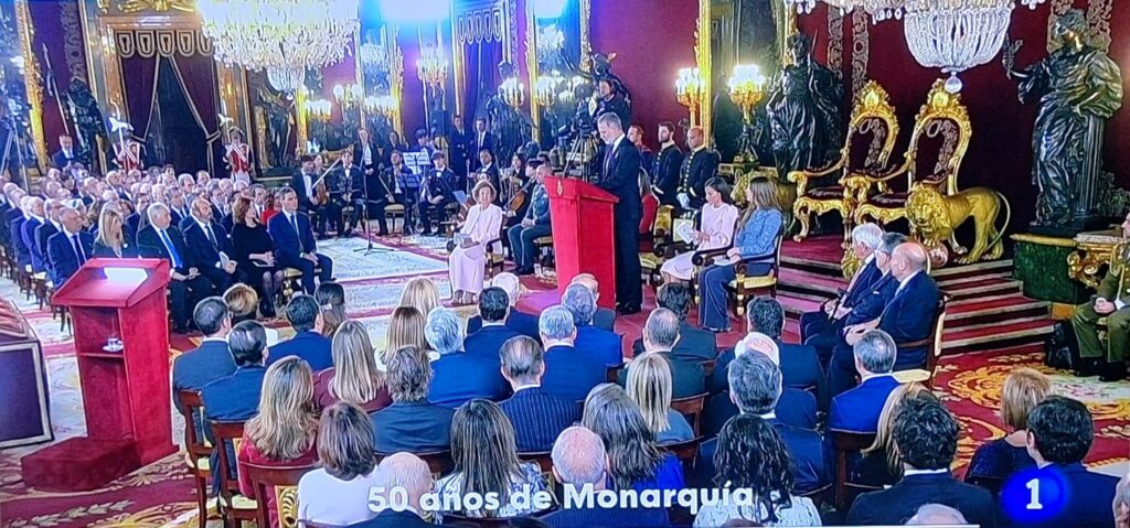 Diálogo, respeto, concordia, generosidad, convivencia, moderación o responsabilidad fueron expresiones a las que recurrió don Felipe en un extraordinario discurso en el Palacio Real durante un acto al que no asistieron ninguno de los socios de Gobierno, independentistas o partidos como Sumar y Podemos, y tampoco Vox al no querer cvompartir espacio con un Gobierno corrupto.