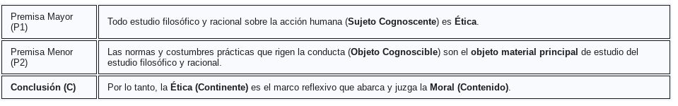 Dentro de este marco reflexivo se encuentra la moral, que es el contenido específico y práctico que la ética estudia. En términos gnoseológicos, la moral es el objeto cognoscible, es decir, la materia, el fenómeno o el código de normas que es analizado por el Sujeto Cognoscente.