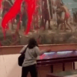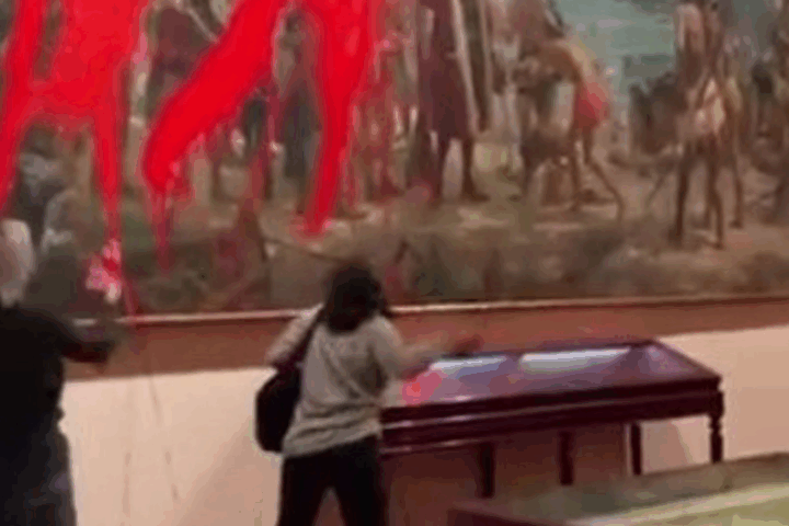Activistas de ‘Futuro Vegetal’ lanzan pintura roja biodegradable contra un cuadro en el Museo Naval
