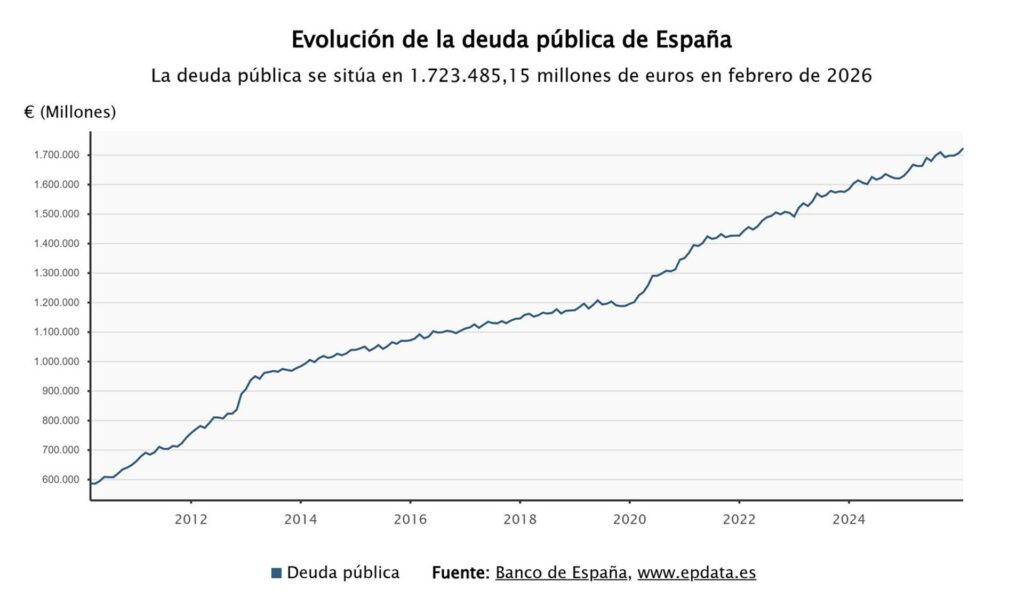 La deuda de las administraciones públicas españolas ha marcado un nuevo hito histórico en febrero de 2026 al alcanzar los 1,723 billones de euros. Según los datos publicados este miércoles por el Banco de España, esta cifra supone un incremento interanual del 4,7%. Este nuevo pico supera el anterior récord registrado en septiembre, consolidando una tendencia al alza en términos absolutos, con un repunte mensual del 1% respecto a enero.