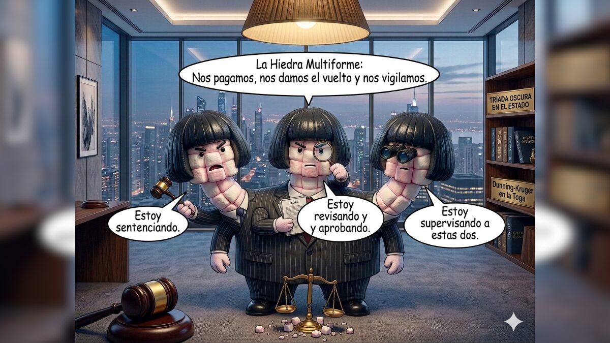 Resulta impactante considerar el supuesto patológico de que una figura así existiera en la realidad. Imaginen la extravagante caricatura de una mujer que se cree una «diosa una y trina», capaz de sentenciar, revisarse a sí misma y supervisar su propia conducta sin rendir cuentas. En el mundo de la ficción literaria, este personaje sería el villano perverso de una tragedia sobre la caída de una nación. Ver a una hiedra multiforme emerger de la cúpula judicial, celebrando que se dan el vuelto con el dinero ajeno mientras se vigilan a sí mismas, es una imagen que debería causar un asombro paralizante. Afortunadamente, tales disparates de autogestión criminal solo pertenecen al plano de la hipótesis académica, pues en la justicia verdadera, la separación de funciones y la salud mental del juzgador son los pilares que impiden que el derecho sea el patio de recreo de una psicopatía multiforme.