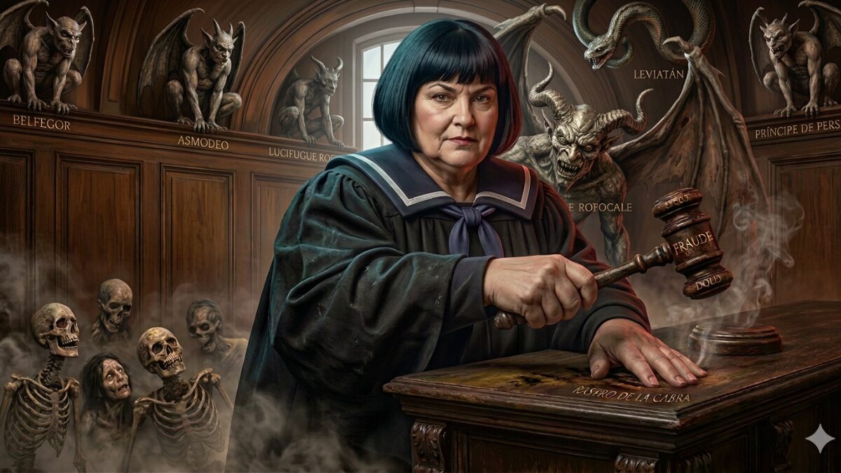 En el blindaje burocrático de su despacho, el demonio Belcebú preside las reuniones donde se aplasta cualquier conato de honestidad. Si el secretario intenta un destello de dignidad, la jueza sofoca esa chispa con la ferocidad del macho cabrío. Ella aniquila la integridad ajena para que nadie escape a su red de complicidad, sin advertir que cada voz que ella silencia es un grito escuchado por Dios, pero que reclama su nombre en los fosos del infierno.