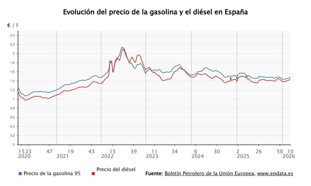 Ambos carburantes reafirman así el cambio de tendencia respecto a la espiral bajista que les había llevado a acumular un abaratamiento del 3,5%, en el caso de la gasolina, y de más del 5%, para el gasóleo, desde noviembre, y acumulan unas subidas del 2,15% y 2,6%, respectivamente.