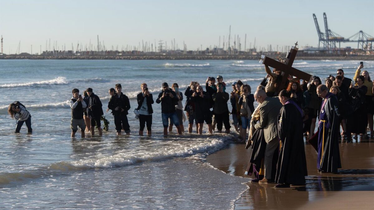 Los cristos del barrio de El Cabanyal de València han llegado a primera hora de este viernes a la orilla de la playa para recordar a todas las personas fallecidas en el mar, así como a los marineros muertos durante su trabajo.