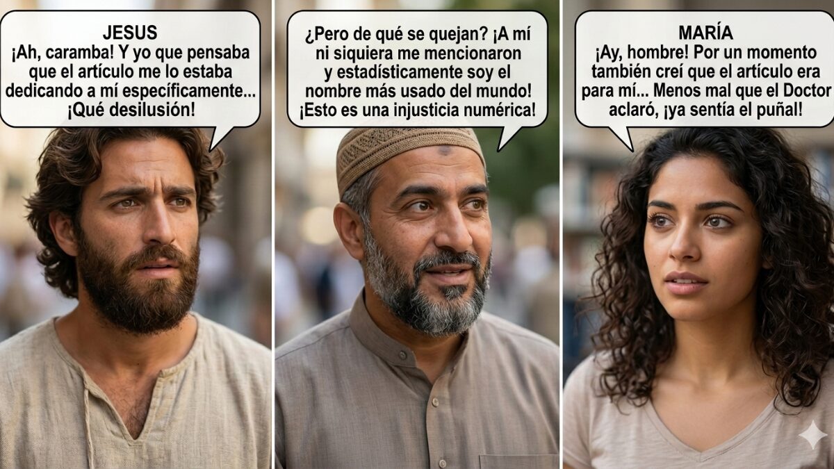 Finalmente, confío en que mis apreciados lectores comprendan ahora las razones estrictamente estadísticas y sociológicas por las cuales, en mis artículos de prensa, recurro preferentemente a nombres como María o Jesús. Lejos de pretender una dedicatoria personal que algunos puedan interpretar como un «puñal en el pecho» o una alusión directa a su intimidad, el uso de estos apelativos obedece a su inmensa frecuencia en nuestro entorno. No se trata de un juicio individual, sino de un ejercicio de demografía literaria; empleo lo común para explicar lo complejo, sin que ello signifique que cada «Jesús» o cada «María» deba sentirse protagonista de una crítica personal, sino más bien parte de una vasta realidad compartida.