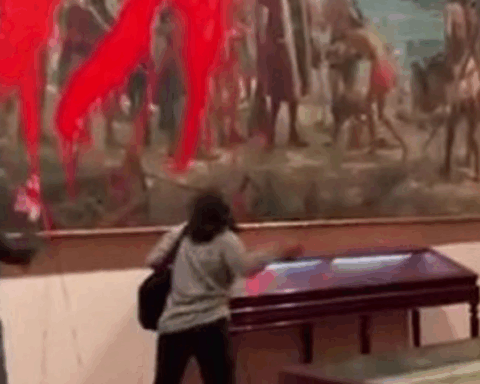 Activistas de ‘Futuro Vegetal’ lanzan pintura roja biodegradable contra un cuadro en el Museo Naval 12 de octubre de 2025