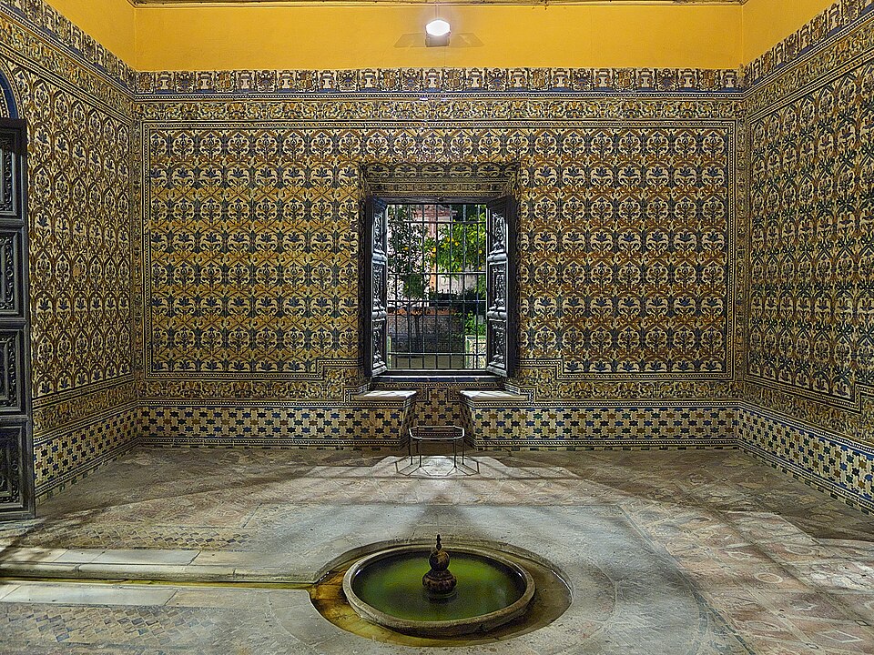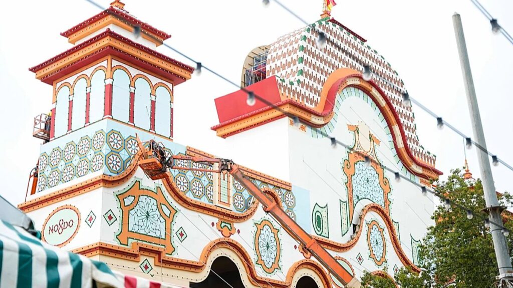 Por su parte, los detalles ornamentales proceden del Cenador de Carlos V, un pabellón recreativo del Alcázar construido sobre restos almohades. El diseño de la feria rescata especialmente la riqueza de sus azulejos renacentistas, considerados una joya artística, vinculando así el recinto ferial con uno de los espacios más íntimos y simbólicos de la corona en Sevilla.