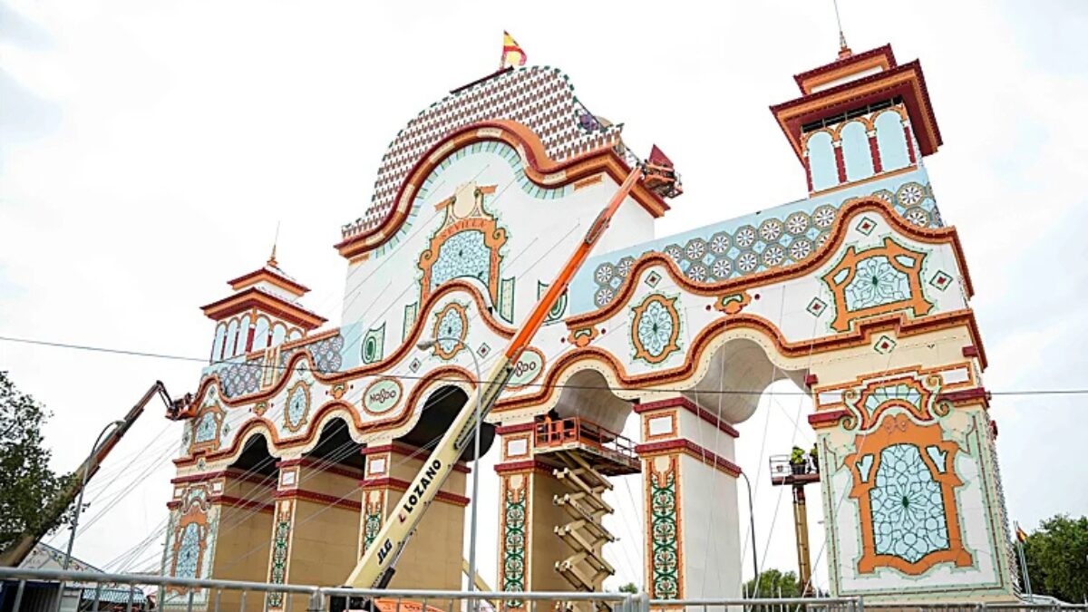 Imagen de la portada de la Feria de Sevilla 2026, en sus últimos días de montaje. (EP)