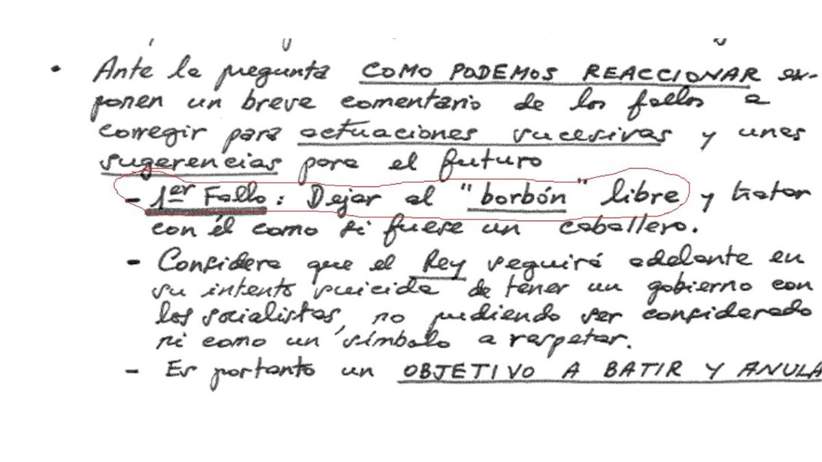 El contenido resulta inquietante. En él se afirma que el “primer fallo” cometido fue “dejar al Borbón libre” y haberle tratado “como a un caballero”. A partir de esa premisa, el documento sostiene que el entonces jefe del Estado se habría convertido en un “objetivo a batir y anular”, una expresión que refleja el nivel de ruptura y radicalización que se respiraba en determinados sectores.